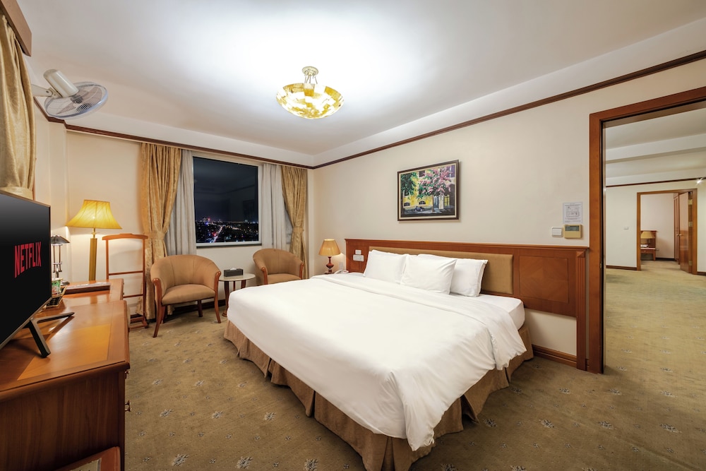 Tendrás un centro de negocios, tintorería y un servicio de recepción las 24 horas a tu disposición. ¿Estás organizando un evento en Hanói? En este hotel tienes a tu disposición 650 metros cuadrados de espacio con zona para conferencias. Se ofrece servicio de transporte al aeropuerto (ida y vuelta) de pago disponible 24 horas. Relájate en el spa completo, que ofrece masajes. Si quieres divertirte, aquí tienes una piscina cubierta y gimnasio, entre muchas otras instalaciones. Encontrarás además conexión a Internet wifi gratis, servicio de celebración de bodas y asistencia turística (adquisición de entradas). Degusta algo de cocina internacional en Lotus Restaurant, uno de los 3 restaurantes de este hotel. El alojamiento también te ofrece servicio de habitaciones las 24 horas y una cafetería. Qué mejor forma de acabar el día que con una bebida en el bar o lounge. El desayuno bufé gratuito se ofrece entre semana de 06:00 a 10:00, mientras que el horario de sábados y domingos es de 06:00 a 10:30.- Transporte al aeropuerto: 350000 VND por vehículo (solo ida, máximo 4 personas)