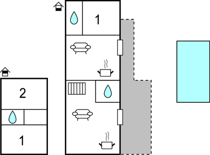 The house consists of two residential units, one of which has two bedrooms on the upper floor and a living room on the ground floor. The other unit has one bedroom and a living room. It is ideal for two families or groups of friends who want to spend a holiday together and have privacy.