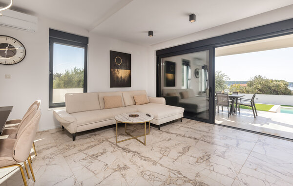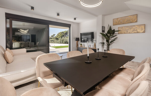 This modern holiday home in Banjol offers you and your family or friends a stylish ambience and wonderful views of the sea over two floors. The high-quality, individually furnished bedrooms ensure comfort and relaxation, while the open-plan living area offers space for cooking, eating and relaxing together. The outdoor summer kitchen invites you to socialise in the evenings and the heated outdoor pool provides refreshment and relaxation. Surrounded by a well-tended, fenced garden with high-quality garden furniture, you can enjoy the sun here.